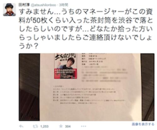 ロンドンブーツ1号2号で有名な田村淳さん。 そのマネージャーが、田村淳さんが6月23日に出版する予定の本「35点男の立ち回り術」の紹介文書を道端で紛失したそうです。 そこで困った淳さんは、自分のツイッターで落とし物が無かったか呼びかけ、一般…