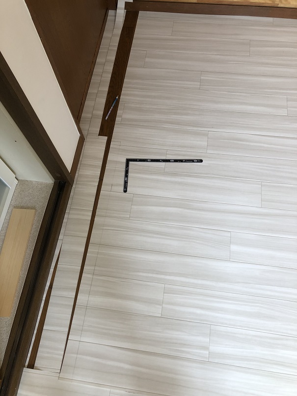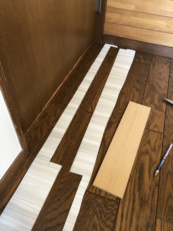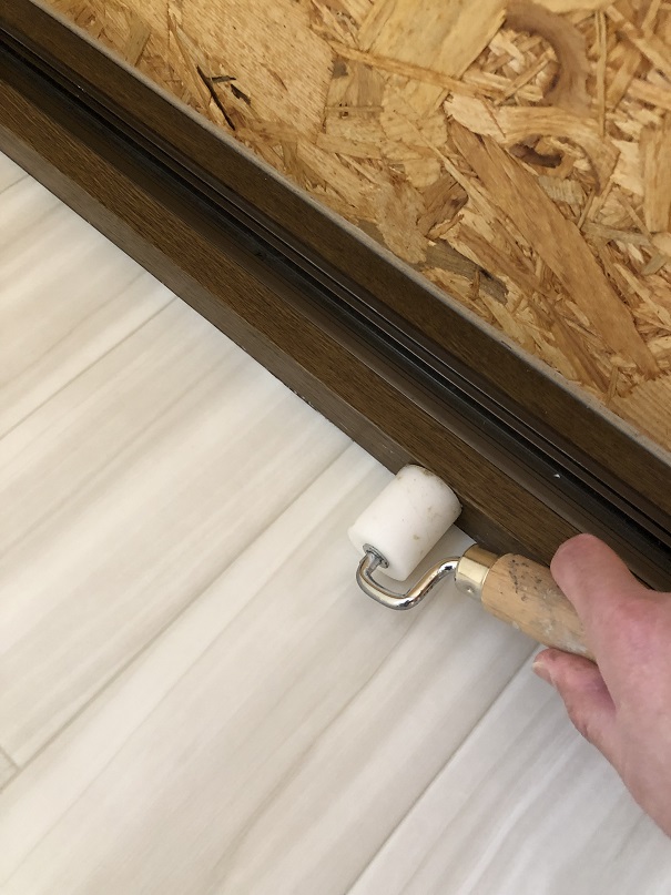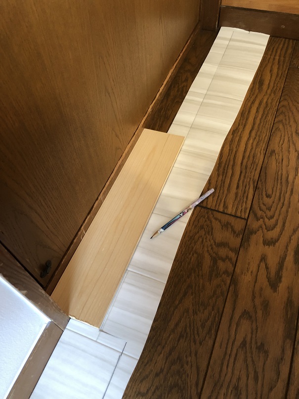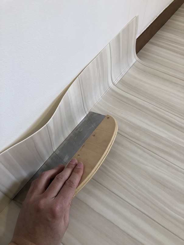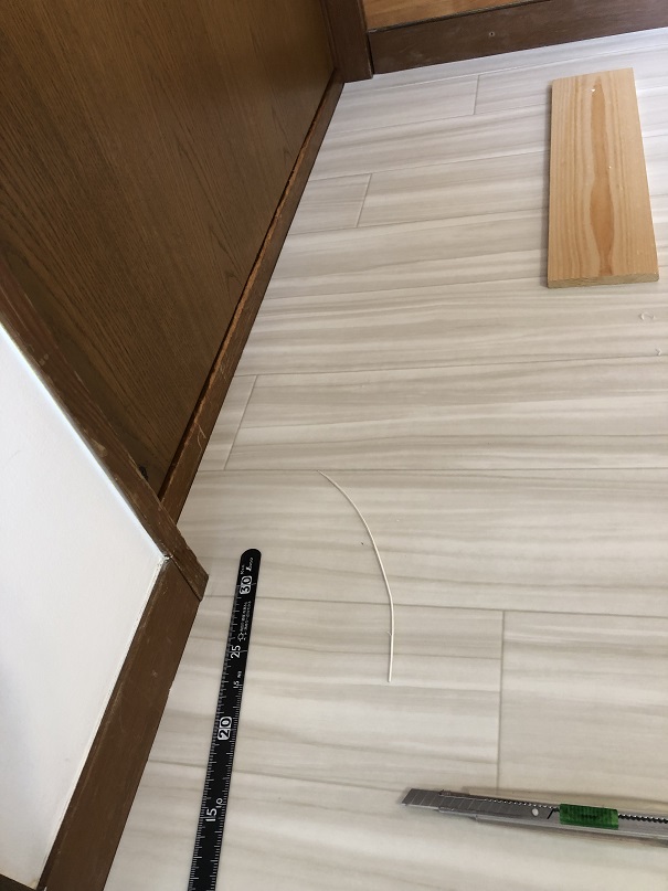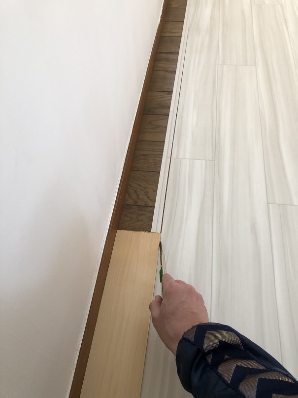 平行の取れている板を壁に当てて、クッションフロアをカッターでカット