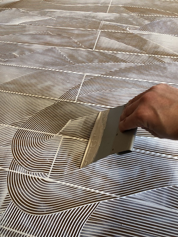 接着剤を塗った側のCFを空気が入らないよう少しづつ戻し、撫で刷毛を使って空気を抜くように圧着させる