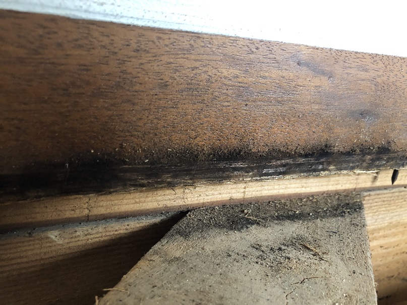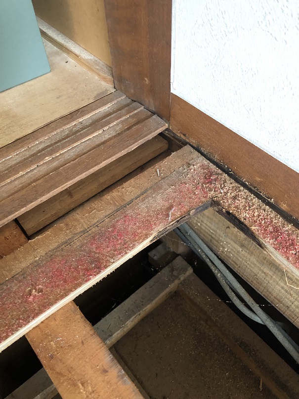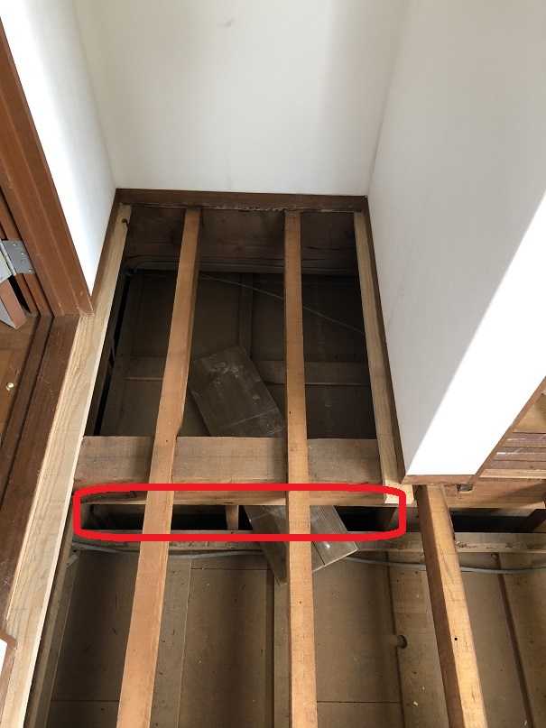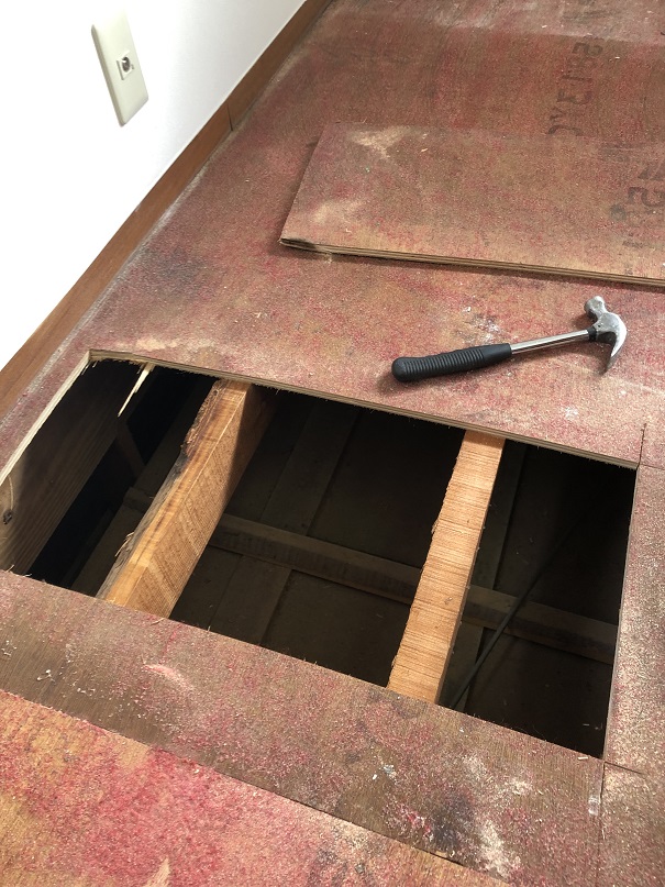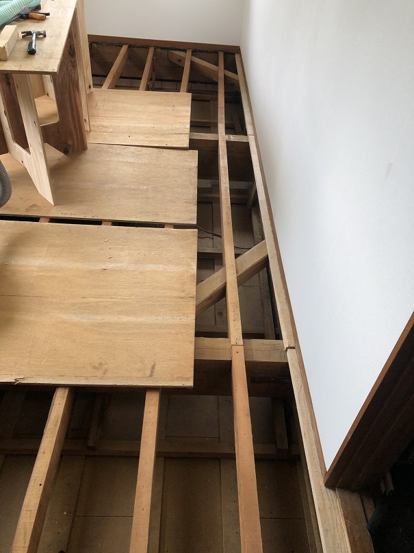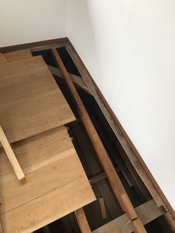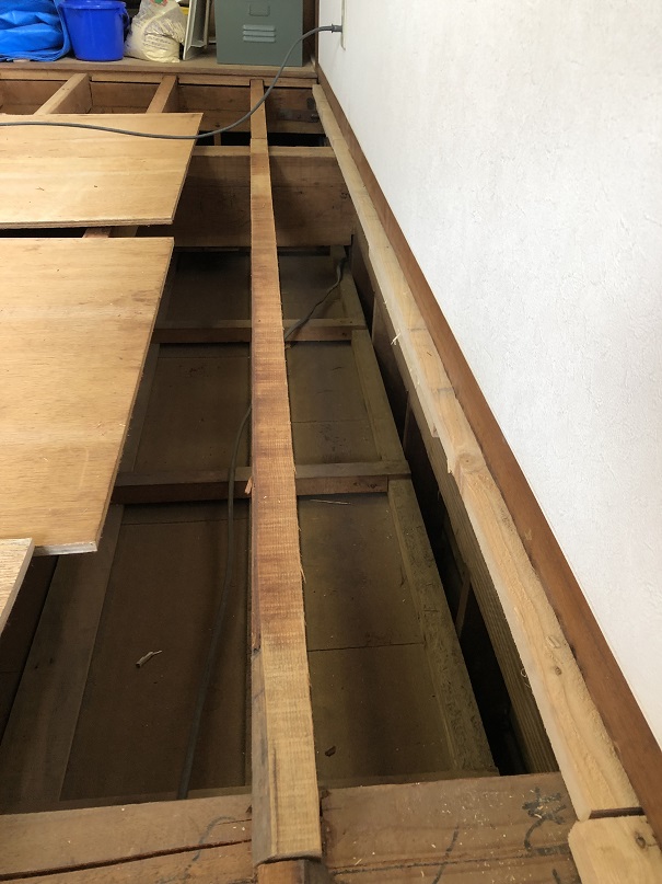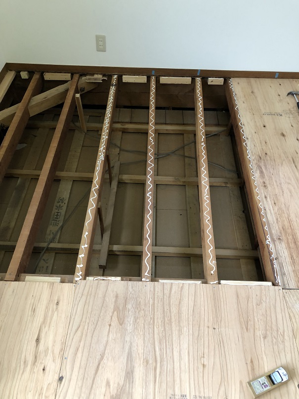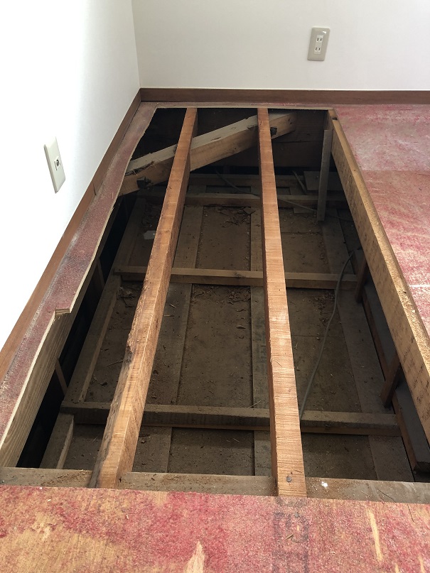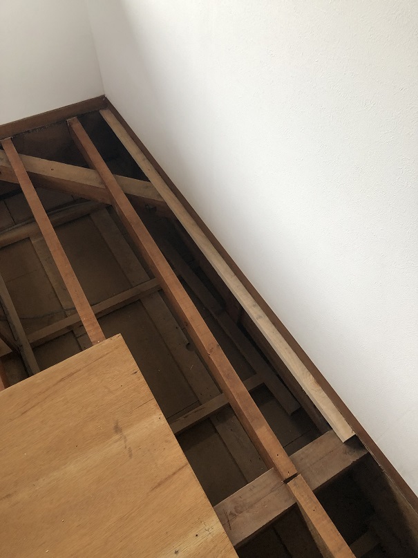 もちろん下地の根太に乗らないと1階の天井が抜けてしまうので、剥がした床材を足場としますが、固定していないので、端に乗ってしまうと1階の天井材を踏み抜いてしまうので注意が必要です。