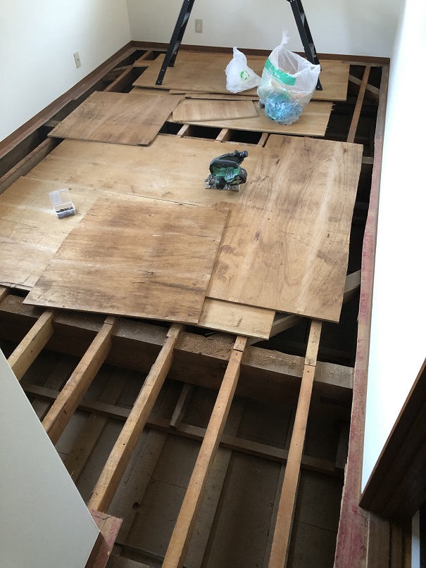 次は、2階の8畳の部屋の床が絨毯の接着で見た目も悪く、軋み・ふかふかな部分があるため、床板を張り直しました。