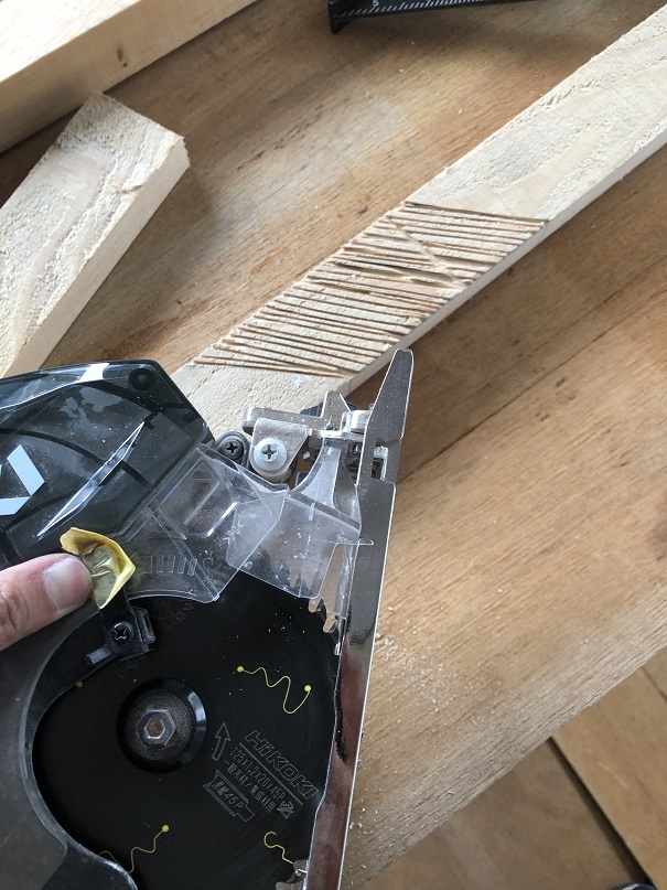 丸のこは床板の下地まで切らないよう板の厚さ12mmに合わせて丸のこの刃の高さを調整して壁際をカットしてバールではがしていく
