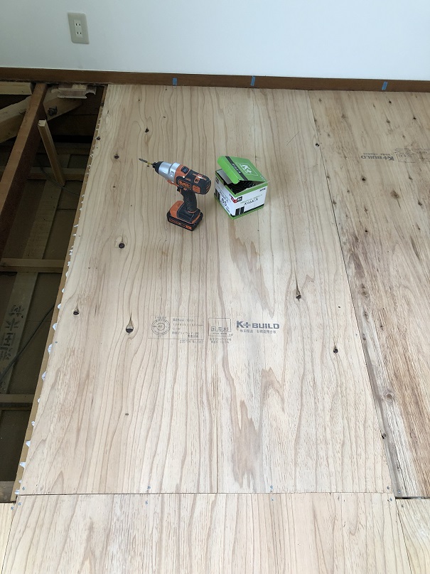 床職人を根太に塗って合板をビス固定