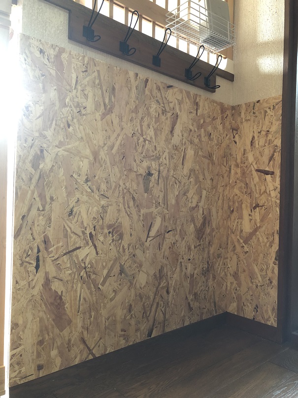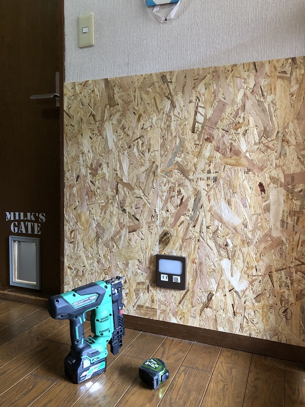 板材は傷が目立ちにくく、そのままでおしゃれ感があるのでOSB合板にし、巾木との段差が少ないように厚み9mmのものを使用しました。